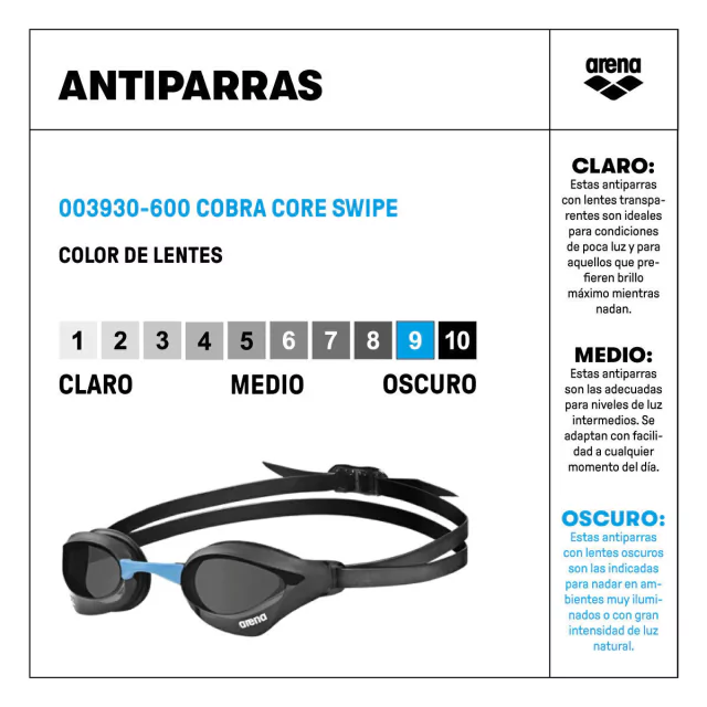 Las antiparras arena Cobra Core Swipe producidas en Japón y con aprobación FINA son la perfección hidrodinámica. Con lentes de perfil bajo espejados, molduras de alta tecnología y una silueta afilada, las antiparras arena Cobra Core Swipe minimizan la resistencia contra el agua con un diseño ultra elegante y super hermético; son ideales para nadadores de nivel intermedio y expertos. ¡Además son perfectas para triatlon!