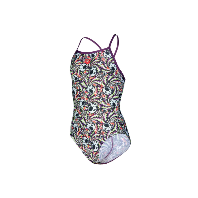 Una combinación de remolinos psicodélicos y calaveras divertidas hace que este traje se destaque dentro y fuera del agua. Su espalda abierta ofrece total libertad de movimiento y una sensación natural al nadar, mientras que el tejido más resistente de arena garantiza durabilidad, resistencia al cloro y conservación de la forma. Perfecto para jóvenes nadadoras sin miedo, que entrenan con energía y estilo.