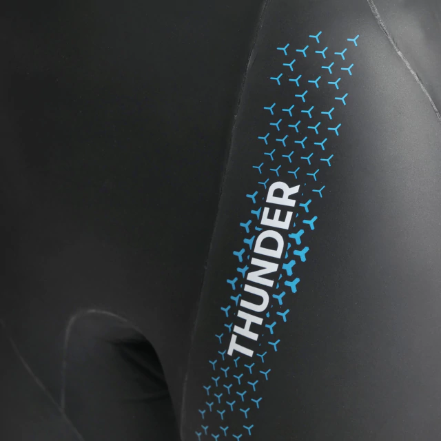arena Thunder también cuenta con un cuello redondo y bajo que evita rozaduras, costuras doblemente ciegas 100% impermeables y un cierre con cremallera para un calce seguro.